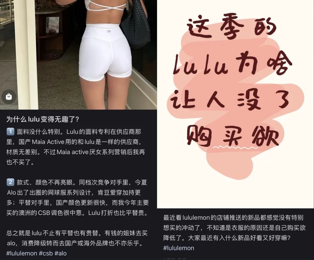 《中国经营报》曾提到一个现象:如今大多消费者在选购lululemon产品时,只考虑那几个经典的爆款。原因固然与消费惯性有关,但小红书上关于“lululemon为何越来越无趣”的讨论中,网友们不约而同地提道:“来来去去就那几个款,换个颜色竟也能叫新品。”