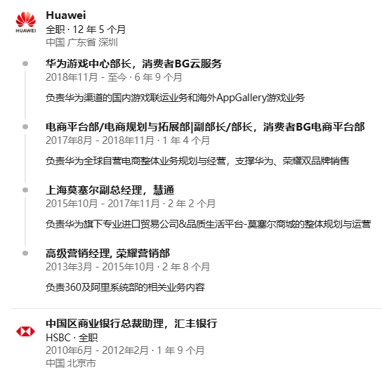 据领英信息,张某敏先后在汇丰银行、上海莫塞尔以及华为任职。从职位来看,其业务范围包括电商、游戏等内容,还曾担任过华为游戏中心部长。