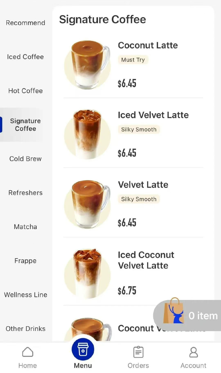 据瑞幸美国APP公布的菜单显示,其饮品价格在3.45美元(约合24.71元)至7.95美元(约合56.94元)之间。其中美式咖啡4.45美元(约合31.9元)、拿铁5.75美元(约合41.2元);生椰拿铁、丝绒拿铁定价6.45美元(约合46.2元);最贵的羽衣果蔬饮品定价7.95美元(约合人民币57元)。