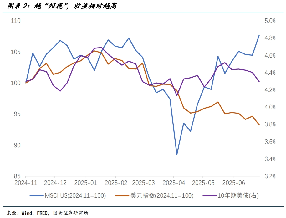 从时间维度和可替代性的角度看,当前美股、美债与美元逐渐分野。美元定价的时间维度最长,美股最短,美债居中;而美股的可替代性较低,美元的可替代性较高,美债亦居于中间。