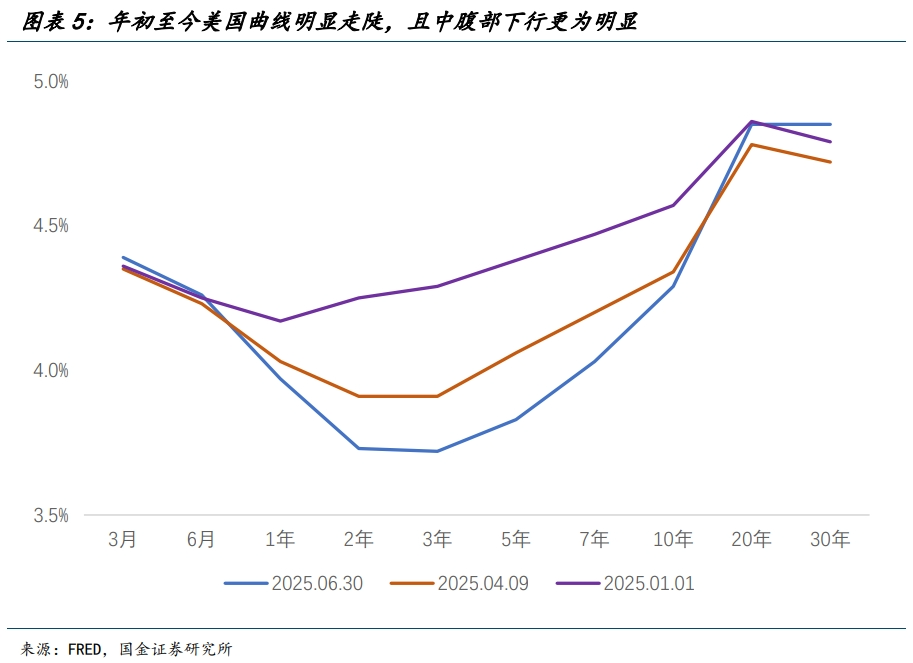 美债定价的时间维度较复杂,短期与长期定价并存。短端(1-10年)更多定价衰退和降息预期,长端(10-30年)更多定价远期财政可持续性担忧及关税对美元信用的冲击。从2024年9月解除倒挂后(2s10s),美债收益率曲线开始陡峭,且中腹部下行更为明显。