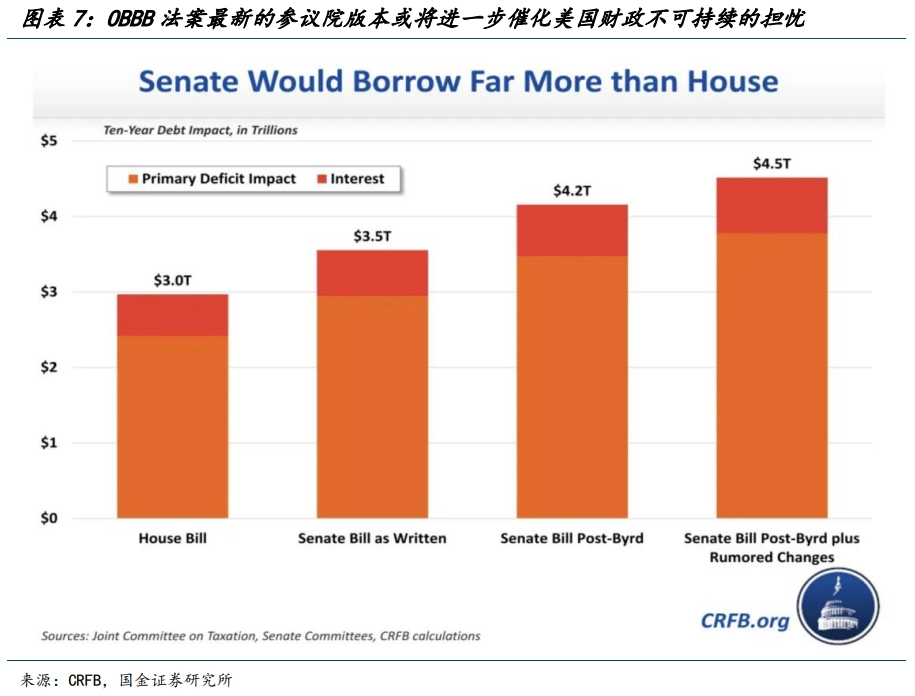 与此同时,美国财政的可持续性也没有得到解决。最新的OBBB法案(截止6月30日的参议院版本)并没有明显的在支出(赤字削减)上发力,反而是进一步展现了参议院的财政鸽派姿态。根据CRFB的最新估计,参议院和解法案将在未来十年的维度增加约3.5万亿至4.2万亿美元的赤字,这比众议院通过的法案版本多出近1万亿美元的水平。