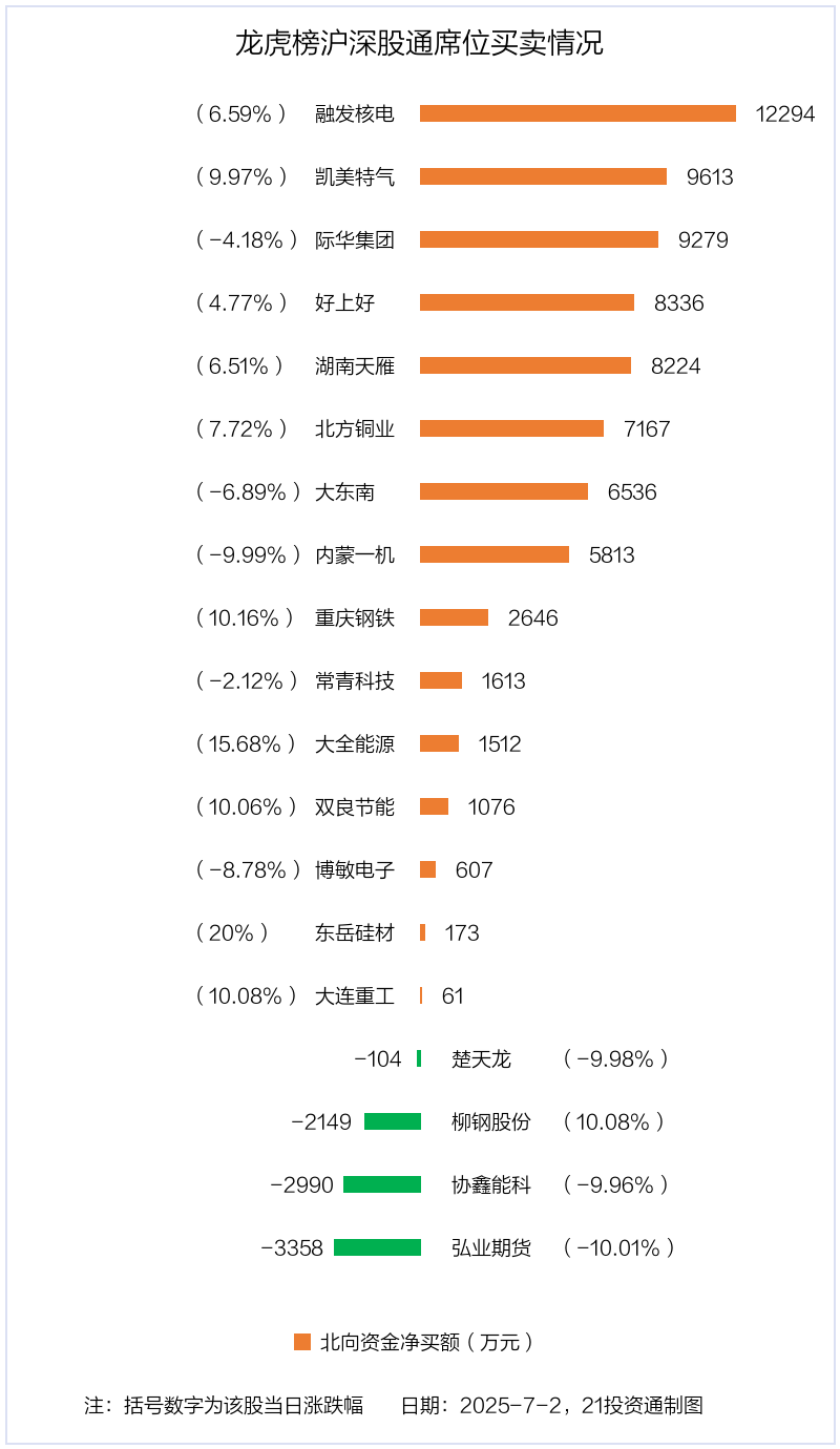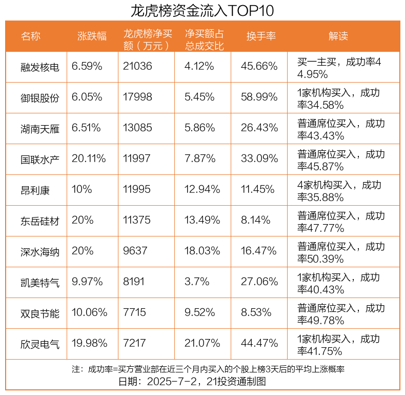 7月2日,上证指数下跌0.09%,深证成指下跌0.61%,创业板指下跌1.13%。盘后龙虎榜数据显示,共有60只个股因当日异动登上龙虎榜,资金净流入最多的是融发核电(002366.SZ),达2.1亿元。