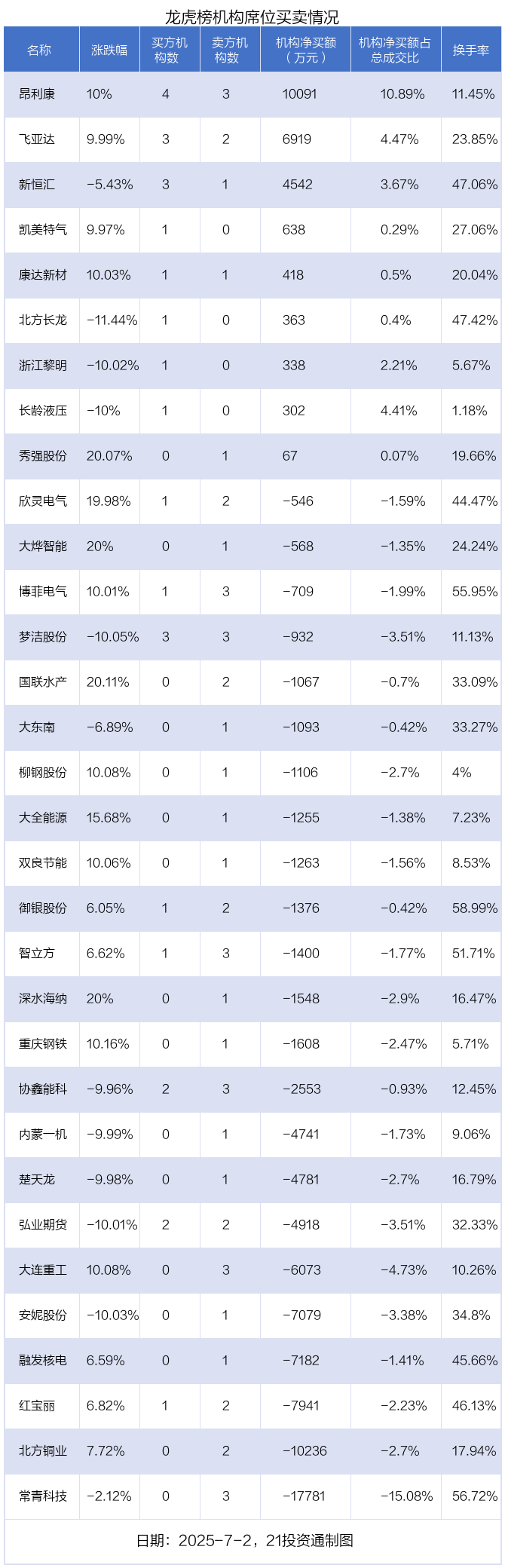 7月2日,32只个股龙虎榜出现了机构的身影,机构合计净卖出6.41亿元。具体来看,机构净买入9股,净卖出23股。
