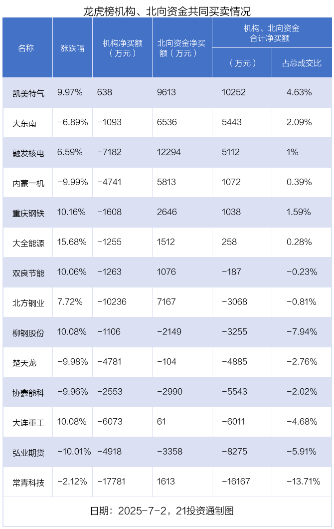 值得注意的是,机构和北向资金共同净买入了凯美特气;共同净卖出了楚天龙、柳钢股份、协鑫能科、弘业期货;在融发核电,北方铜业,大东南,内蒙一机,重庆钢铁,常青科技,大全能源,双良节能,大连重工上出现分歧,其中,机构净卖出融发核电7182.4万元,北向资金净买入1.23亿元;机构净卖出北方铜业1.02亿元,北向资金净买入7167.06万元;机构净卖出大东南1092.81万元,北向资金净买入6535.89万元;机构净卖出内蒙一机4740.82万元,北向资金净买入5813.02万元。