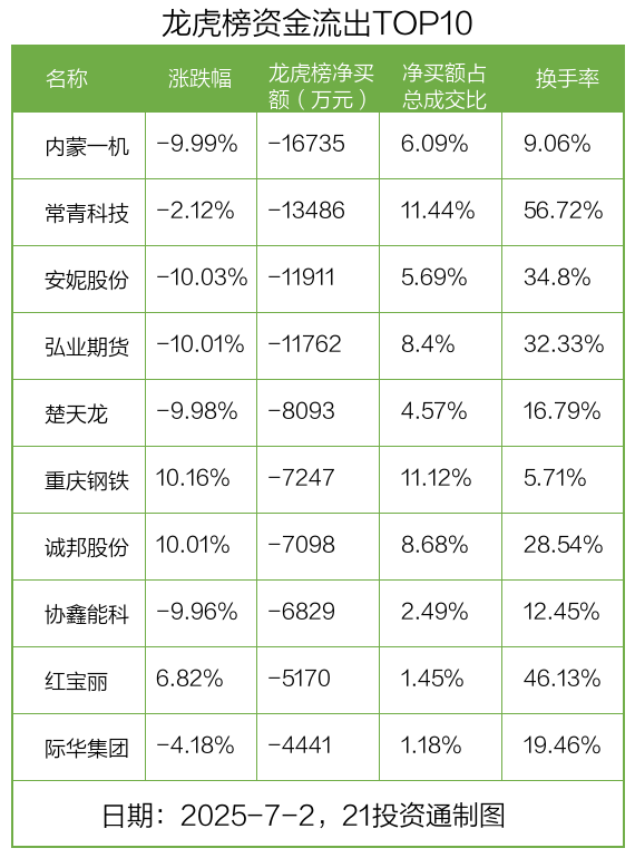 而龙虎榜中资金净流出最多的是内蒙一机(600967.SH),被净卖出为1.67亿元,占总成交金额的6.09%。内蒙一机收盘下跌9.99%,换手率为9.06%。