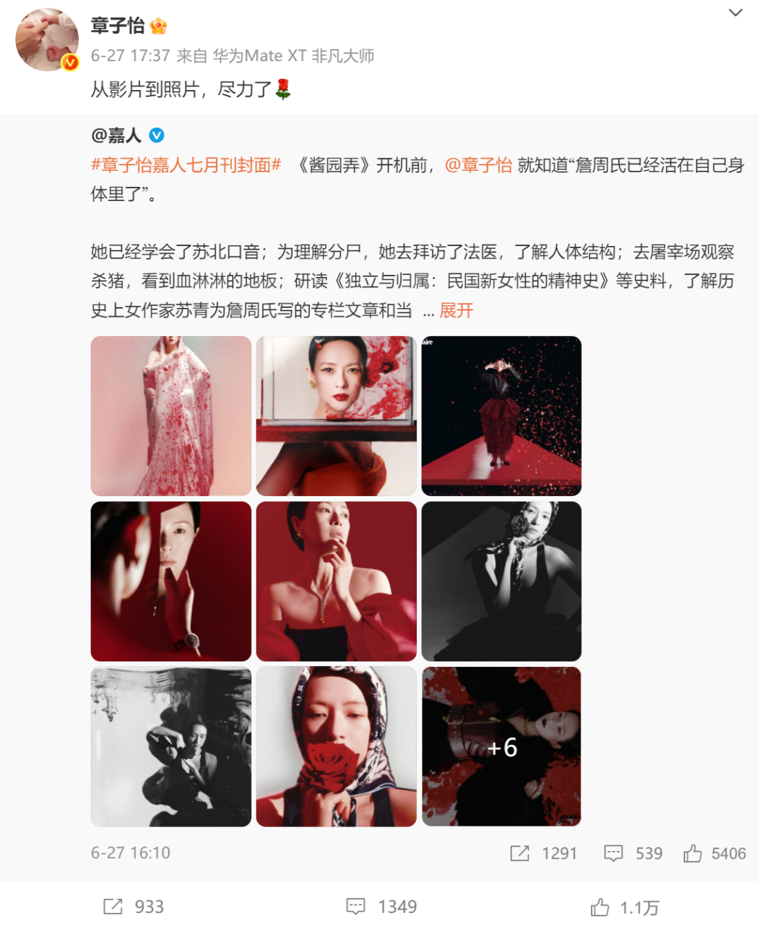 6月27日,在转发《嘉人》7月刊封面时,章子怡如此说道。