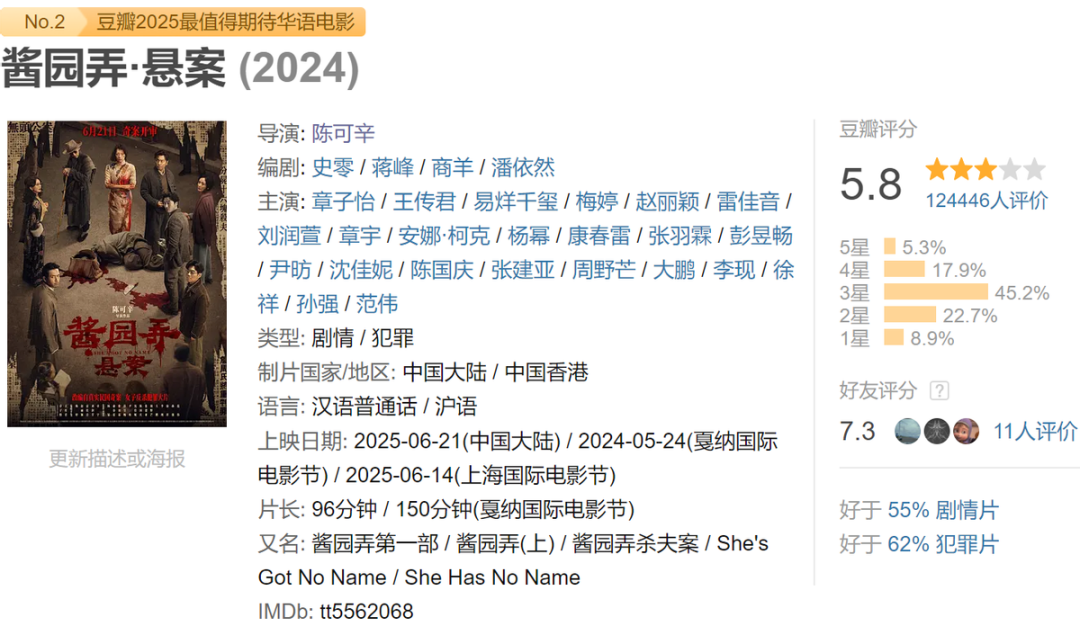 以上种种,不仅对潜在观众产生不好的影响,也直接为《酱园弄》开分5.9作出了“突出贡献”,并进一步影响潜在观众们买票的想法。