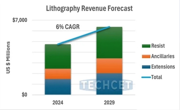 研究机构TECHCET最新预测显示,受半导体市场复苏推动,2025年光刻材料收入预计增长7%,达到50.6亿美元。这一增长主要由先进光刻胶需求大幅增长驱动,特别是EUV光刻胶预计同比增长30%。随着光刻胶需求的增长,上游原材料需求也会迅速加大。