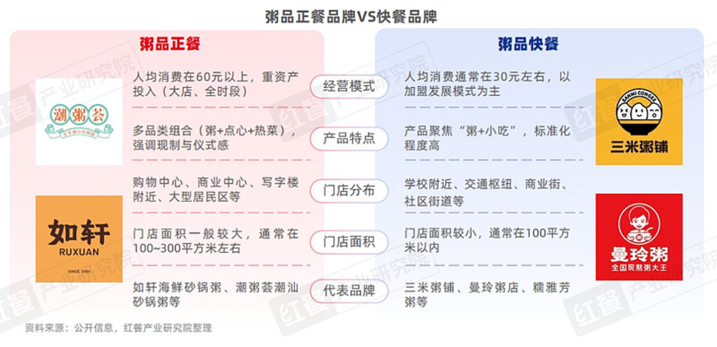目前,粥品赛道主要由正餐品牌与快餐品牌组成,由于不同的定位和市场需求,正餐品牌与快餐品牌在经营模式、产品特点、门店情况等方面发展各异。