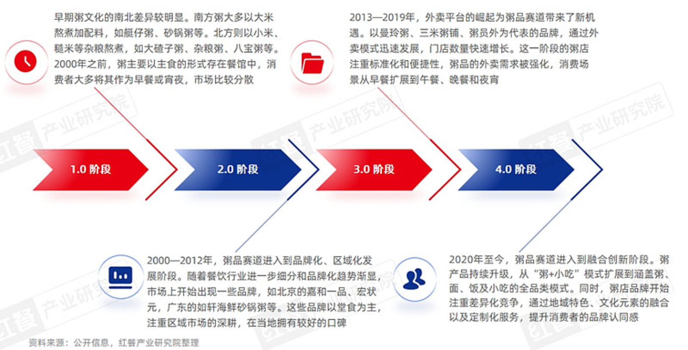 从粥的发展历程来看,粥品在我国的发展历程可分为四大阶段。如今,历经粥品品类已经从一道主食独立发展成为一个品类,并逐渐走向品牌化、规模化发展,进入融合创新的4.0阶段。