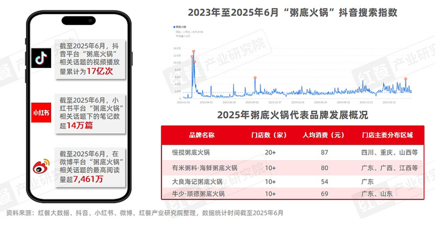 在粥品赛道不断发展的同时,以粥为锅底,融合各种食材的粥底火锅也逐渐被大众所熟知。在抖音平台上的搜索指数不断走高,形成多个波峰,最高峰值超12万。目前,粥底火锅已从广东地区逐渐扩展至全国。知名品牌包括有米粥料·海鲜粥底火锅、大良海记粥底火锅等,在小红书、微博等平台积累了较高人气。