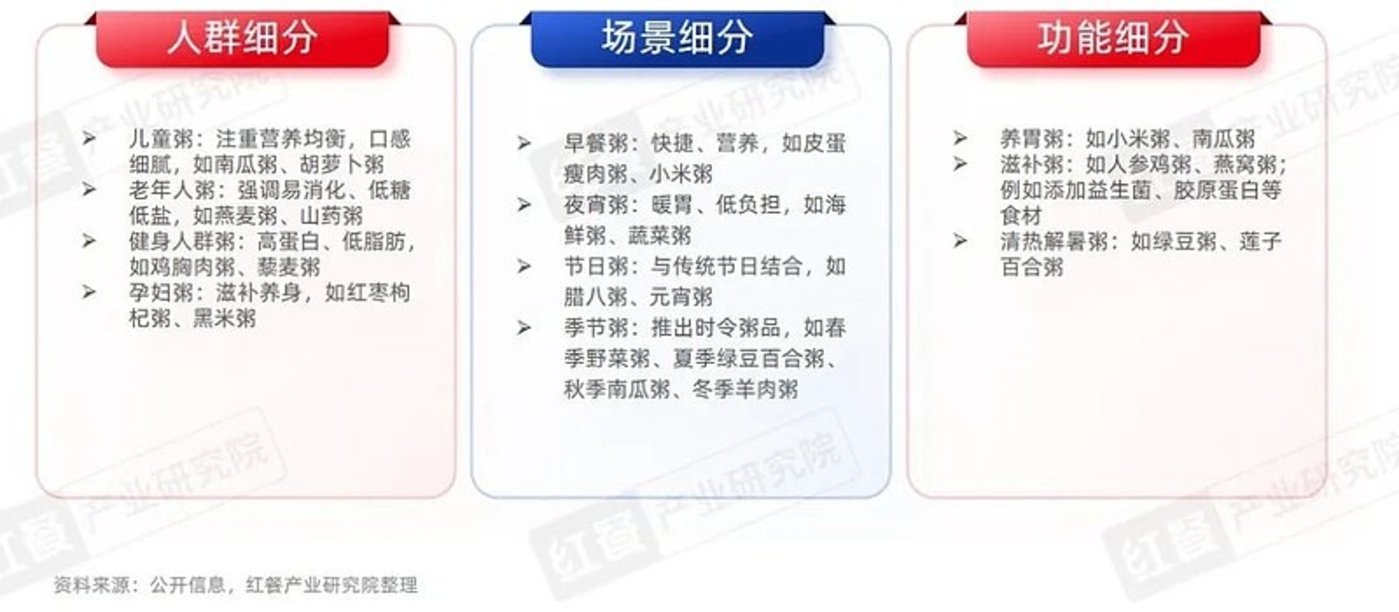 从人群角度看,粥品品牌针对不同年龄段和健康需求进行定制,如老年人的低糖易消化粥、儿童的营养均衡粥及健身人群的高蛋白低脂粥等。功能上,粥品已拓展至养生、调理、美容等领域,如养胃粥、滋补粥等,体现出了食疗文化和健康生活方式的重要性。场景上,粥品的消费场景从早餐延伸至下午茶、夜宵、外卖等,甚至成为商务餐选择,成为适应快节奏生活下的便捷健康需求。