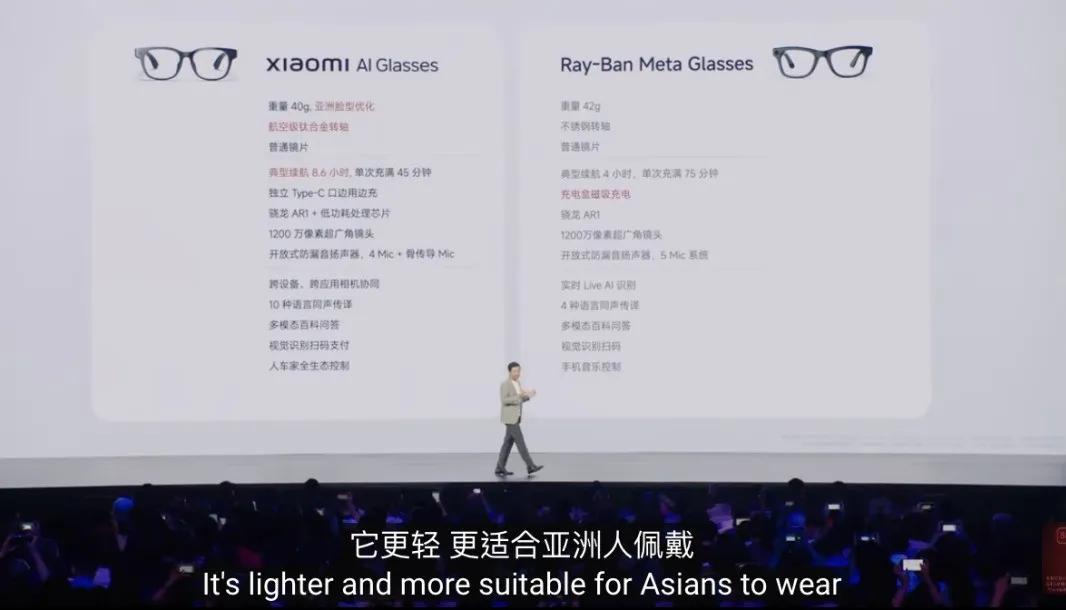 他表示,二者相比,小米AI眼镜更轻——小米40g,Meta 是42g,更适合亚洲人佩戴;续航更强,电池容量提升了64%,典型续航达到8.6小时,Meta是4小时;单次充满45分钟,Meta需要75分钟。