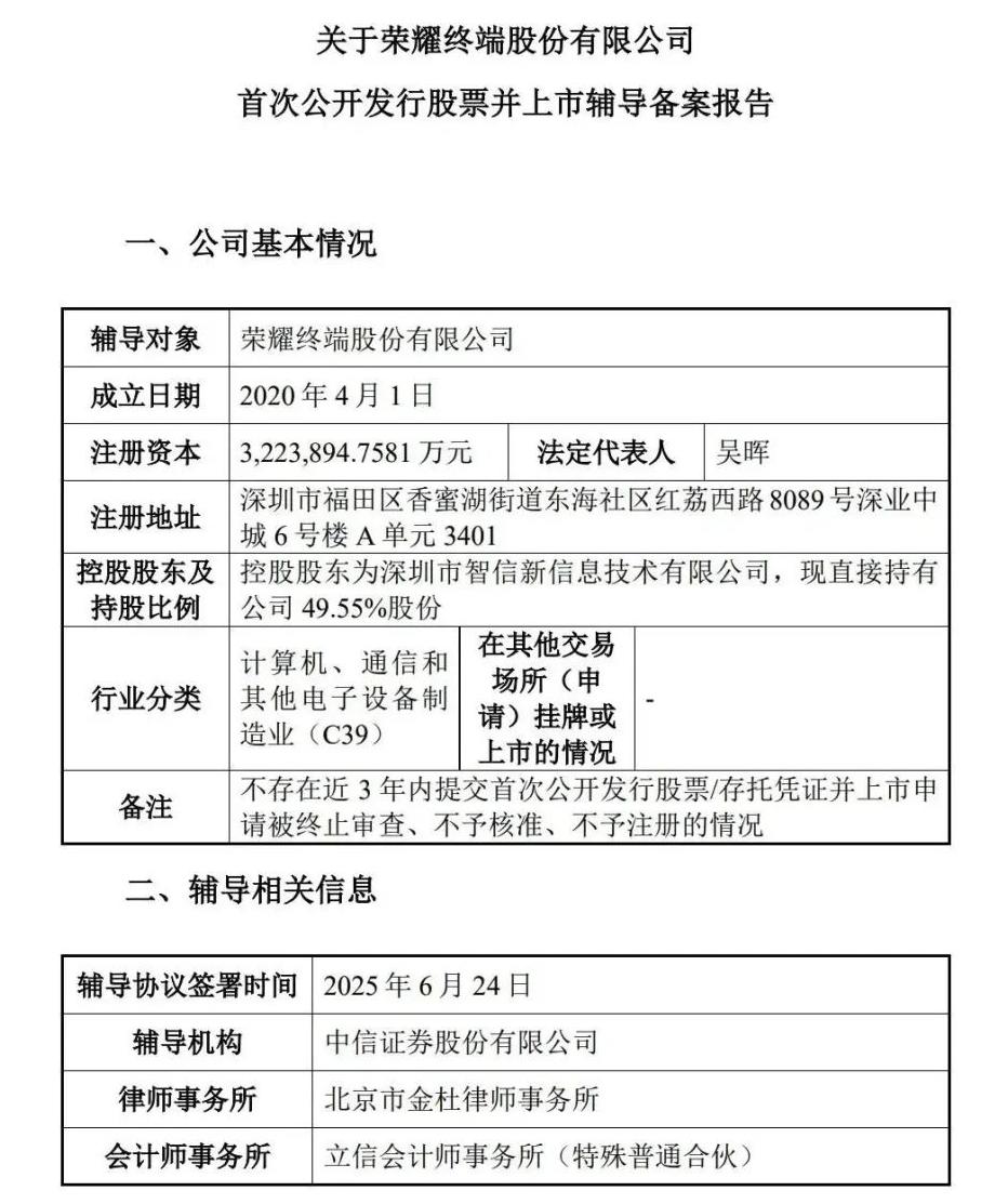 据中国证监会网站披露,荣耀终端股份有限公司获上市辅导备案,辅导券商为中信证券。而根据辅导工作安排,将于2026年1月至3月完成上市辅导。