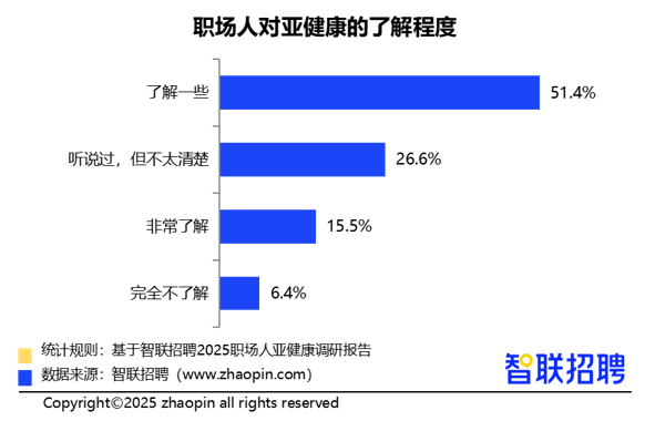 随着生活水平的提升,人们对亚健康的了解和重视程度也在提升,职场人谁还没刷到过几条“亚健康自测”?智联招聘调研数据显示,66.9%的职场人表示了解亚健康,其中15.5%非常了解;另外,26.6%的职场人虽然不太清楚具体概念,但是听说过“亚健康”;表示完全不了解的仅6.4%。