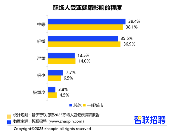 亚健康问题不可小觑。超9成职场人受到身体不适不同程度的影响,39.4%被折腾到“中度难受”,占比最高;35.5%“轻微糟心”;更有17.3%直接被“严重+极重度”席卷全身,能全身而退不受影响的“幸运儿”仅7.7%。