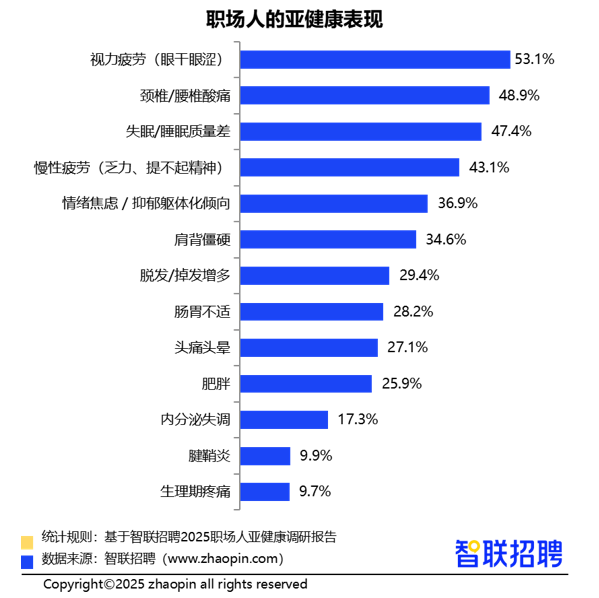 为洞见职场人存在的亚健康问题,智联招聘通过问卷调研的方式,对平台用户展开调研,回收1805份有效样本,发布《2025职场人亚健康情况调研报告》,既启示职场人重视健康管理,也呼吁企业将“健康关怀”纳入职场生态建设,守护职场人的健康。
