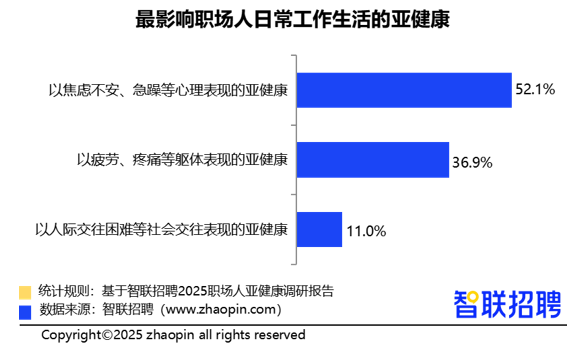 最痛的不是身体痛,而是精神折磨。52.1%的职场人曾经历焦虑不安、急躁等心理表现,比身体疲劳(36.9%)、人际交往拧巴(11%)更让人难受,更影响日常工作生活。