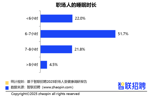 数据显示,大多数职场人难以保持8小时睡眠,51.7%职场人的睡眠时长为6-7小时,健康睡眠时长对他们来说简直难如登天,另有21.8%的职场人能睡到7-8小时,保障基本睡眠时长。