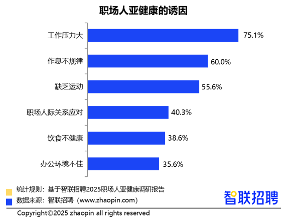 不是打工人不想要倍儿棒的身体,是人在江湖实在有太多身不由己。智联招聘数据显示,75.1%的职场人认为亚健康的主要原因是“工作压力大”,甲方爸爸的夺命连环call、老板的“再改一版”、DDL的“步步紧逼”,分分钟把人逼成“高压气球”。还有俩“猪队友”必须榜上有名:作息不规律(60%)和缺乏运动(55.6%)紧随其后,前半夜加班改方案,后半夜焦虑到失眠,工位到厕所更是“每日步数巅峰”。这“三刺客”联手,职场人想不亚健康都难。
