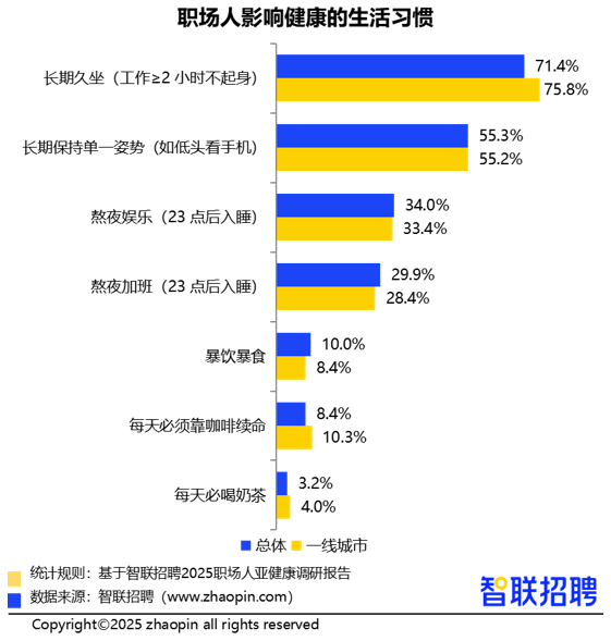 在慷慨激昂的键盘声中,和椅子“黏”在一起是职场人难逃的“宿命”。放眼全国,71.4%的职场人都是“久坐宗师”,2个小时不起身,一线城市职场人比例更高,达到75.8%;还有55.3%化身“木头人”,对着电脑保持同一姿势纹丝不动,34%是“熬夜娱乐大师”,晚上11点以后还在“修仙”。这些不良习惯都在悄悄给职场人的健康“挖坑”。