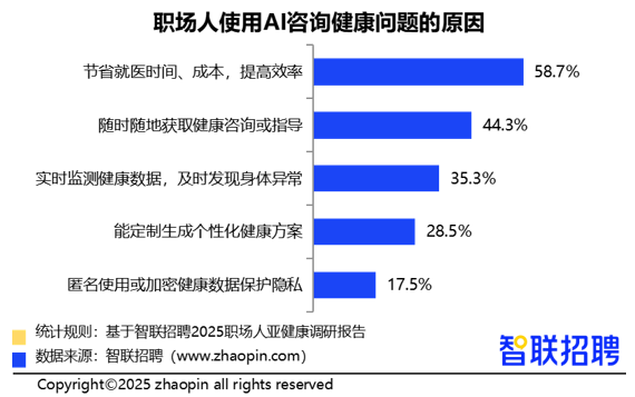 AI逐渐成为职场人的“万能帮手”,不管是充当工作搭子还是生活助手都非常给力。智联招聘数据显示,近3成职场人把AI当“健康顾问”,咨询健康、智能问诊通通安排。问及原因,58.7%的职场人表示其既省钱又省力,效率贼啦高;44.3%表示能随时随地获取健康咨询,不用白不用;35.3%则看中了其能实时监测健康数据的功能,及时发现身体异常。