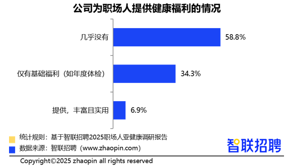 亚健康影响职场人的身心状态,调研数据显示,81%的职场人因为亚健康动了转岗或者调整工作方式的心思——56.2%正纠结改变,24.8%已“换活法”。可部分企业却没能及时“补给”有效措施,58.8%的打工人吐槽公司健康福利几乎为零,仅34.3%能捞到年度体检这种基础福利。公司需要意识到员工身体健康才是“革命”的本钱。