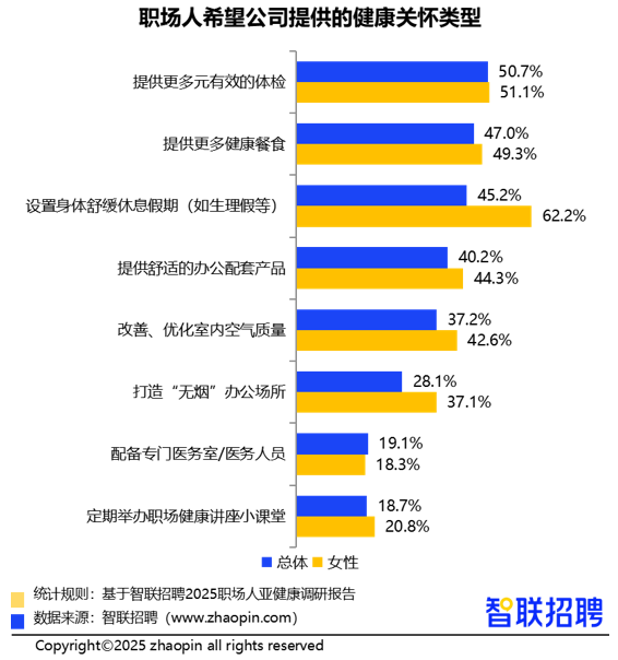 50.7%的职场人希望公司在健康关怀上能安排多元深度体检,47%“求投喂”更多健康餐食。值得注意的是,女性职场人更期待“针对性”的关怀。62.2%的女性职场人希望在比如生理期时能有身体舒缓休息假期。