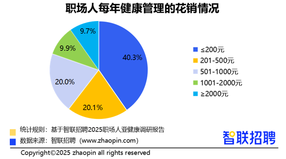 40.3%的职场人在健康管理上秉持着能省则省的原则,捂紧口袋,每年花费最多200元,能自我疗愈的绝不花钱调理;20.1%“稍微松口”控制在200到500元区间,20%咬牙花费1000元封顶,舍得花超2000元的不足10%。