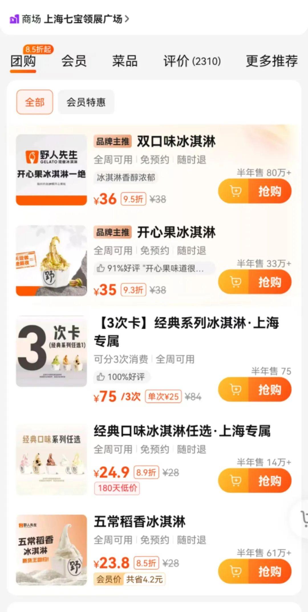 如近一年在各大商场内“刷脸”的Gelato品牌“野人先生”,据窄门餐眼数据,其现有门店数量为566家,主要集中在江浙沪一带和广东省,其在美团、大众点评等平台推出的75元/3次卡的团购套餐,单球价格最低为15元。