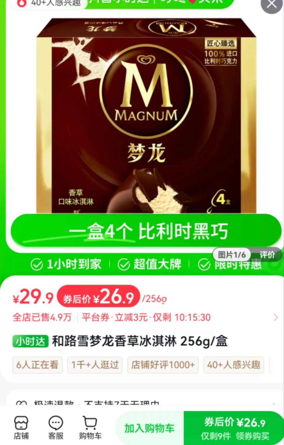 张威(化名)告诉时代周报记者,他上个月在某电商平台下单了30支伊利的雪糕,总价71.91元,折合下来大概2块钱一支,“这样的价格在小超市里是肯定买不到的,而且是顺丰包邮到家。”还有消费者表示,在线上平台下单了35支伊利“芋泥糯兹兹”“苦咖啡”“臻巧雪糕MAX”“克力棒”,最后加上平台的补贴,共消费39.9元。