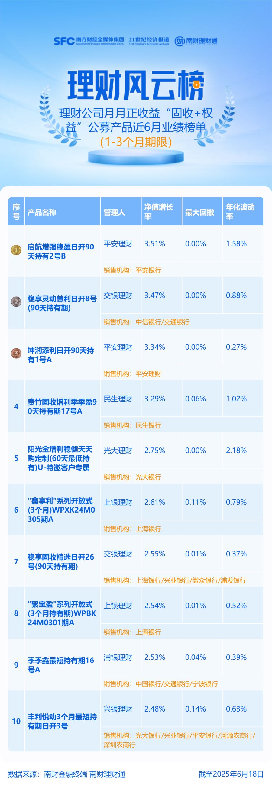 本次“固收+权益”榜单首位的平安理财“启航增强稳盈日开90天持有2号B”近6个月净值增长率为3.51%,领先于同类产品同期平均收益。