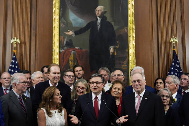 7月3日,在美国华盛顿国会,众议院议长迈克·约翰逊(中)在签署法案后讲话。 新华社/美联