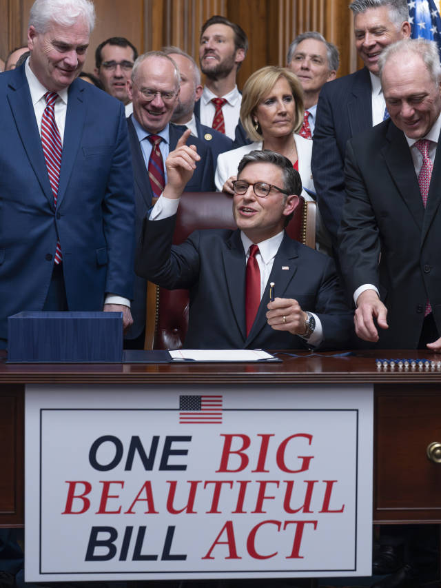 7月3日,在美国华盛顿国会,众议院议长迈克·约翰逊(坐者)在签署法案后庆祝。 新华社/美联