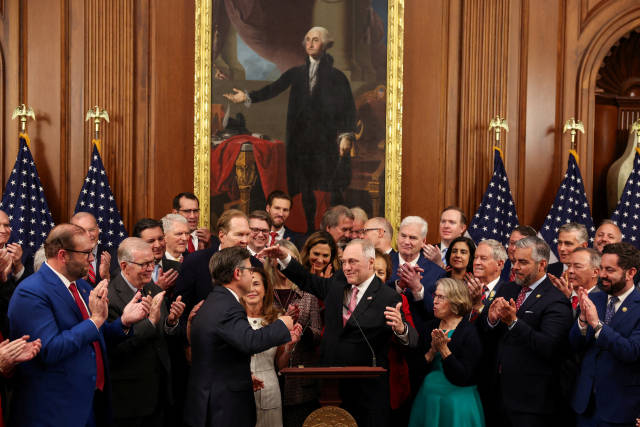 7月3日,在美国华盛顿国会,众议院议长迈克·约翰逊(中左)在签署法案后与另一位众议院议员拥抱。 新华社/路透