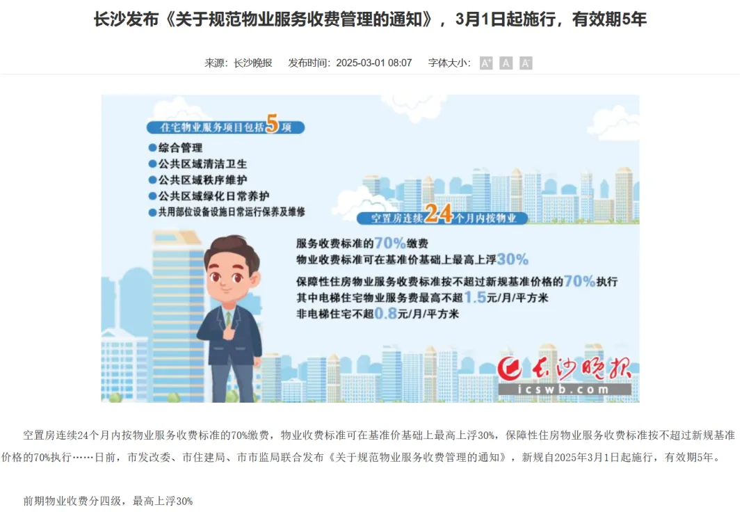 今年2月,长沙出台新规:房子交付后没住人的,前两年物业费打7折,住满两年还空着,后续物业费打9折。镇江也跟上,空置超半年的普通住宅,物业费直接7折。