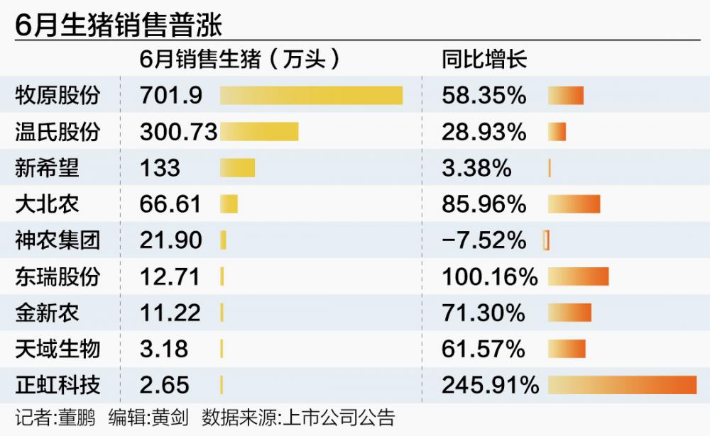 7月7日晚间,牧原股份、新希望等多家公司披露6月销售数据,头部生猪养殖企业半年度经营业绩就此确定。