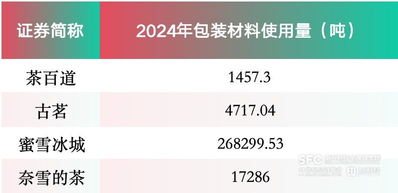 从各家新茶饮上市公司ESG报告披露来看,蜜雪冰城、茶百道、古茗和奈雪的茶全部披露了2024年包装材料使用量,信披正在从“口头承诺”向“数据披露”过渡。