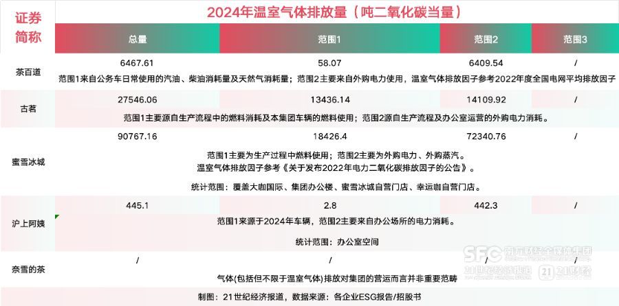 根据各企业披露的2024年ESG报告及招股书,蜜雪冰城、茶百道和古茗完整披露了温室气体排放总量、范围1和范围2排放量,并说明了排放源,前两家还说明了温室气体排放因子的计算方式。