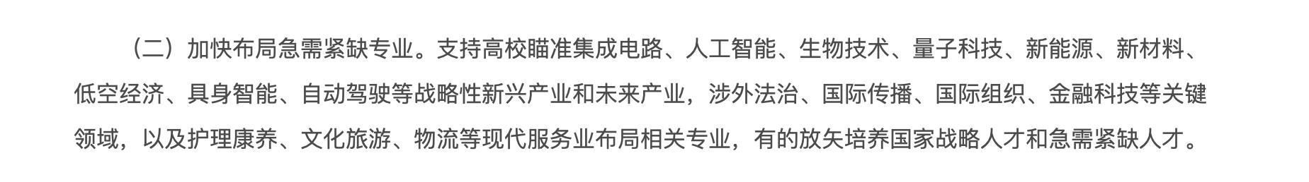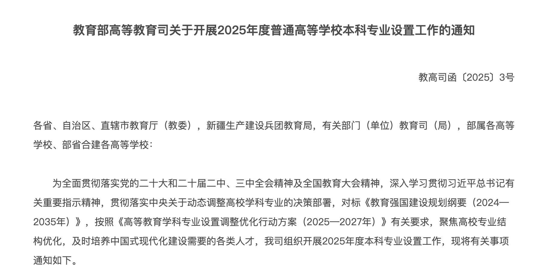 可谁也没想到,今年6月,教育部高等教育司发布《关于开展2025年度普通高等学校本科专业设置工作的通知》,通知中指出“要加快布局急需紧缺专业。支持高校瞄准战略性新兴产业和未来产业、关键领域,以及文化旅游等现代服务业布局相关专业,有的放矢培养国家战略人才和急需紧缺人才。”
