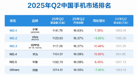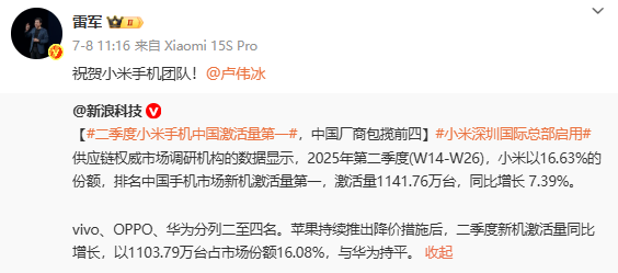 7月8日,雷军曾在微博上转发了一份“供应链权威市场调研机构数据”。数据显示,2025年第二季度(W14-W26),小米以16.63%的份额位居中国手机市场新机激活量榜首,激活量达1141.76万台,同比增长7.39%。