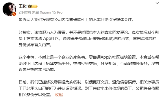 1月8日,小米公关部总经理王化发文回应称,经核实,该情况为人为假冒,并不是王晓雁本人的真实回复评论。真实情况系个别员工在零售通App社区,通过采用修改自己的头像和昵称的形式,冒用王晓雁的身份发布有关内容。