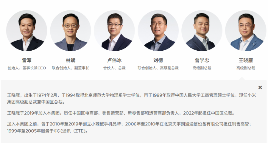 7月11日,小米官网管理团队页面显示,原小米集团副总裁、中国区总裁王晓雁已升任高级副总裁,位列排名第六。