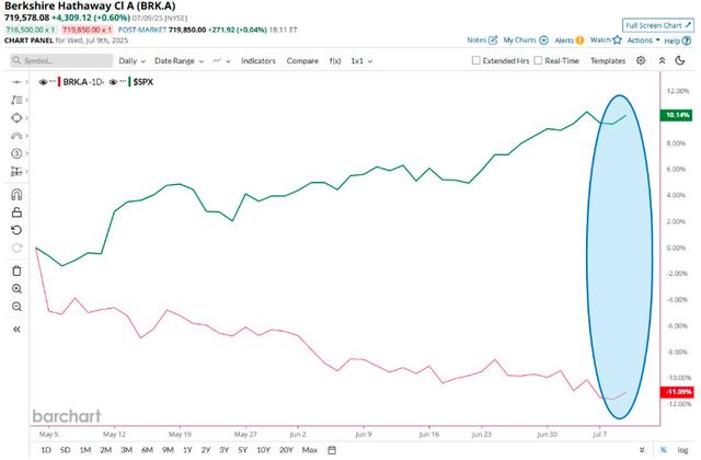 事实上,自今年5月巴菲特在伯克希尔股东大会上表露出“半退休”的意图——宣布今年年底卸任伯克希尔首席执行官以来,伯克希尔的股价已大幅跑输美股大盘逾20个百分点,这令巴菲特的财富面临了一定的缩水。