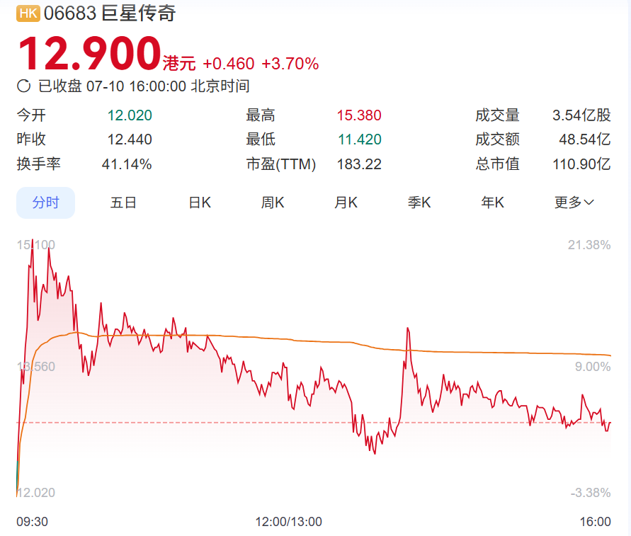 这其中,最引人瞩目的,无疑是被称为“周杰伦概念股”的巨星传奇。7月9日盘中,巨星传奇一度涨超160%,盘中股价最高触及17港元/股,市值突破百亿大关。截至当天下午收盘,巨星传奇收涨94.38%,股价报12.44港元/股,市值为106.9亿港元。7月10日,巨星传奇开盘下跌,随后再次上涨,截至收盘,报12.9港元/股,上涨3.7%,总市值为110.9亿港元。