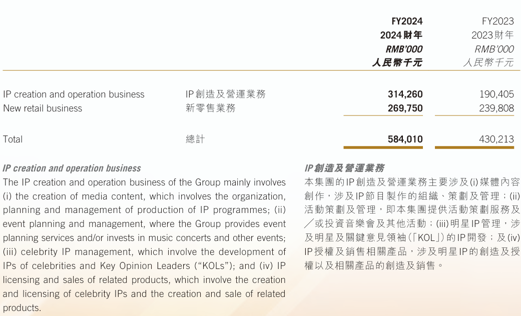 需要注意的是,在巨星传奇两大业务实现增长的时候,其IP创造及营运业务的另一主要收入来源——明星IP管理业务,即巨星传奇通过与明星及KOL合作,从品牌拥有者获得赞助、推广费用及佣金产生的收入,相较2023财年,下滑了约8.43%。