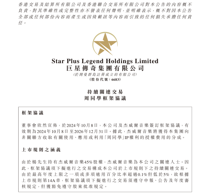 2024年10月8日,巨星传奇发布公告称,公司及杰威尔音乐签订框架协议,有效期为2024年10月8日至2026年12月31日。杰威尔音乐将获得集团向非关联方收取有关使用、应用或利用“周同学”IP权利的授权费用的分成。其还在公告中表示,基于“周同学”IP越来越受欢迎,订立框架协议使集团能够进一步挖掘“周同学”IP权利的商业化机会及市场潜力。