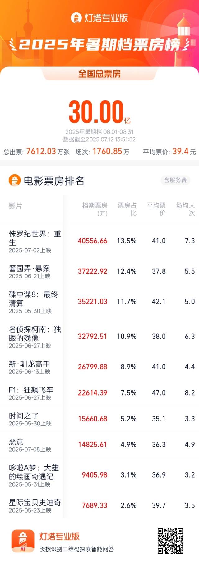 据灯塔专业版,截至7月12日13时51分,2025年暑期档(6月1日—8月31日)总票房(含预售)突破30亿元,总观影人次超7600万。广东2025年暑期档票房已突破4.12亿元,约占全国票房的13.8%,继续稳居“第一票仓”。