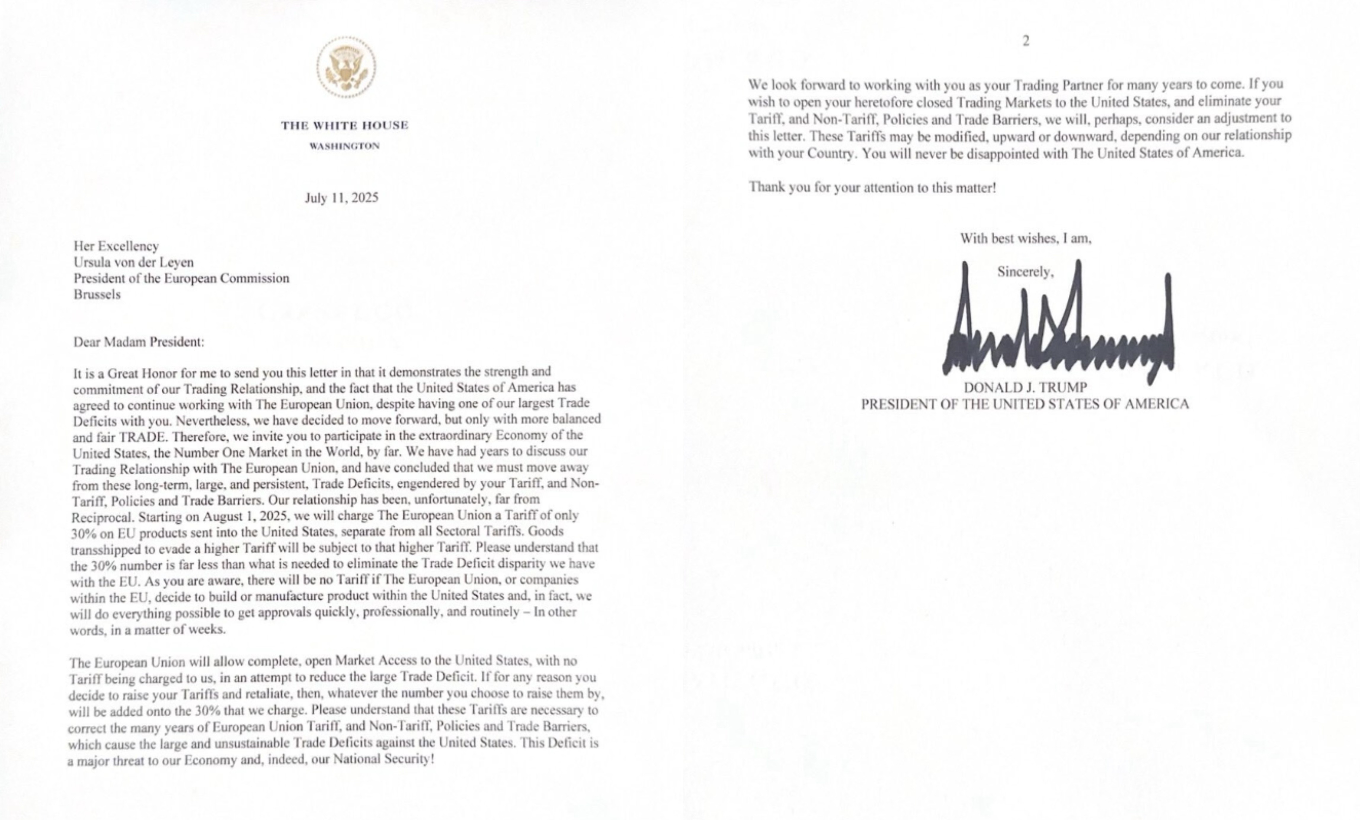 7月12日,美国总统特朗普在社交媒体平台“真实社交”上发布致墨西哥总统辛鲍姆和欧盟委员会主席冯德莱恩的信件,宣布自2025年8月1日起,美国将对来自墨西哥和欧盟的输美产品分别征收30%的关税。